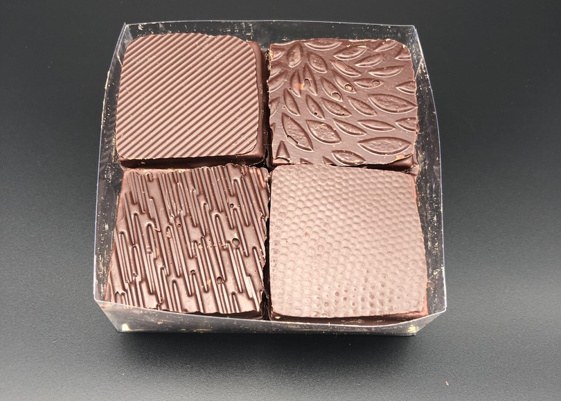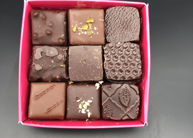 Ganaches, truffes, palets or, fruits, miel, caramel fleur de sel et thym, pralinés amandes et noisettes, caramel, pâtes d'amande, orangettes et griottes à l’alcool. Tous les bonbons sont enrobés de chocolat de couverture noire 64% et lait 38% .