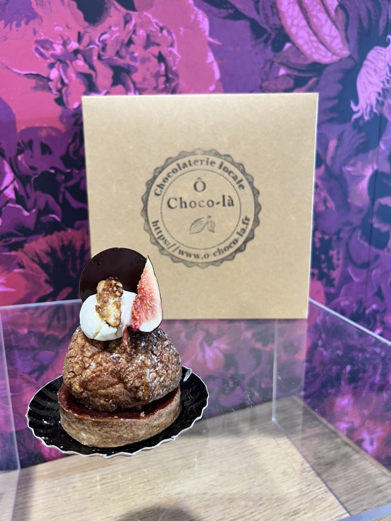 CHOU FIGUE NOIX : pâte sablée, chou craquelin, praliné aux noix, compoté de figue, crème légère infusée à la figue
