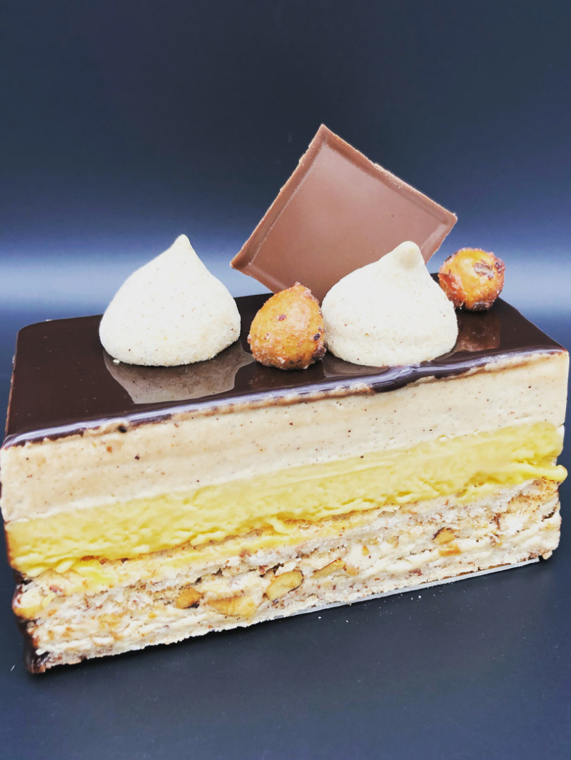 PRALIN : dacquoise, noisettes caramélisées, crémeux passion, crème onctueuse pralinée SANS GLUTEN